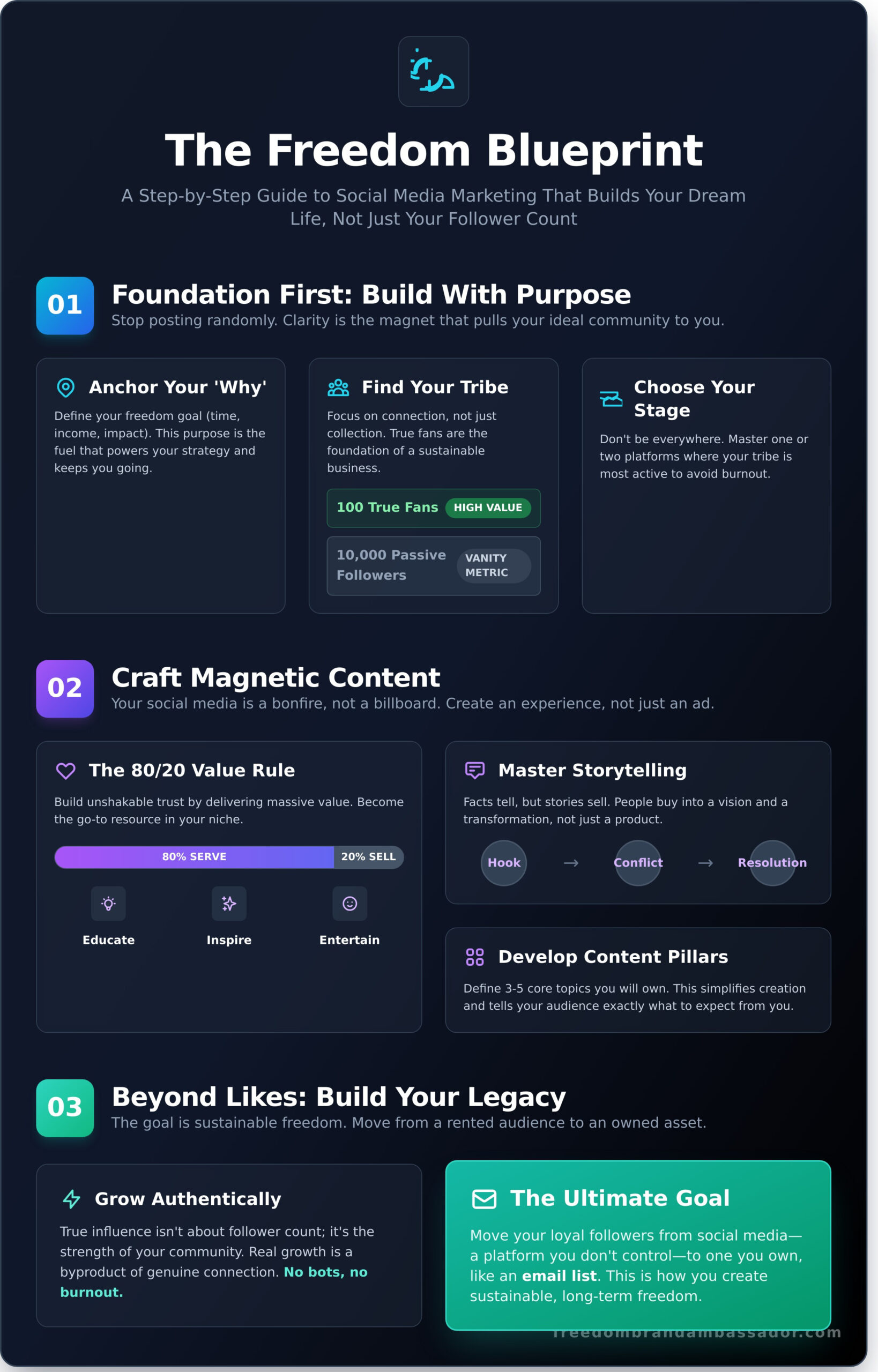 • Move beyond likes to build your legacy. The real goal is moving your loyal followers onto a platform you own, like your email list, to create sustainable freedom.