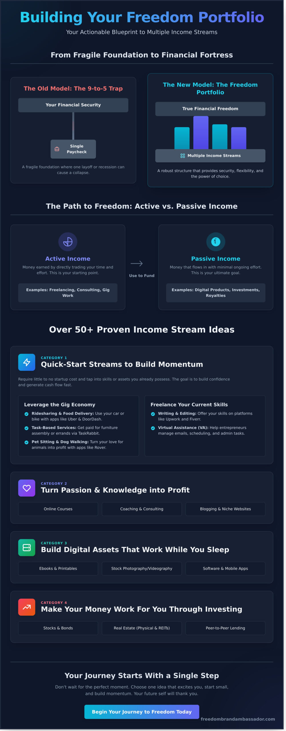 The secret? Use high-value active income streams to generate the capital you need to build your passive income machines. One funds the other, creating a powerful cycle that accelerates your journey to total freedom.