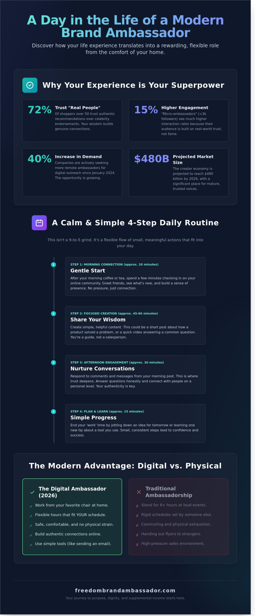 Last Wednesday at 10:15 AM, 64-year-old Susan finished her second cup of tea and opened her laptop to spend 90 minutes connecting with her online community. She wasn't navigating a confusing corporate maze; she was simply enjoying a typical day in the life of a Brand Ambassador from the comfort of her sunroom. You might think this kind of role is only for tech-savvy teenagers, but Susan is part of the 52% of women over 50 who are now finding new purpose and independence in the digital economy.