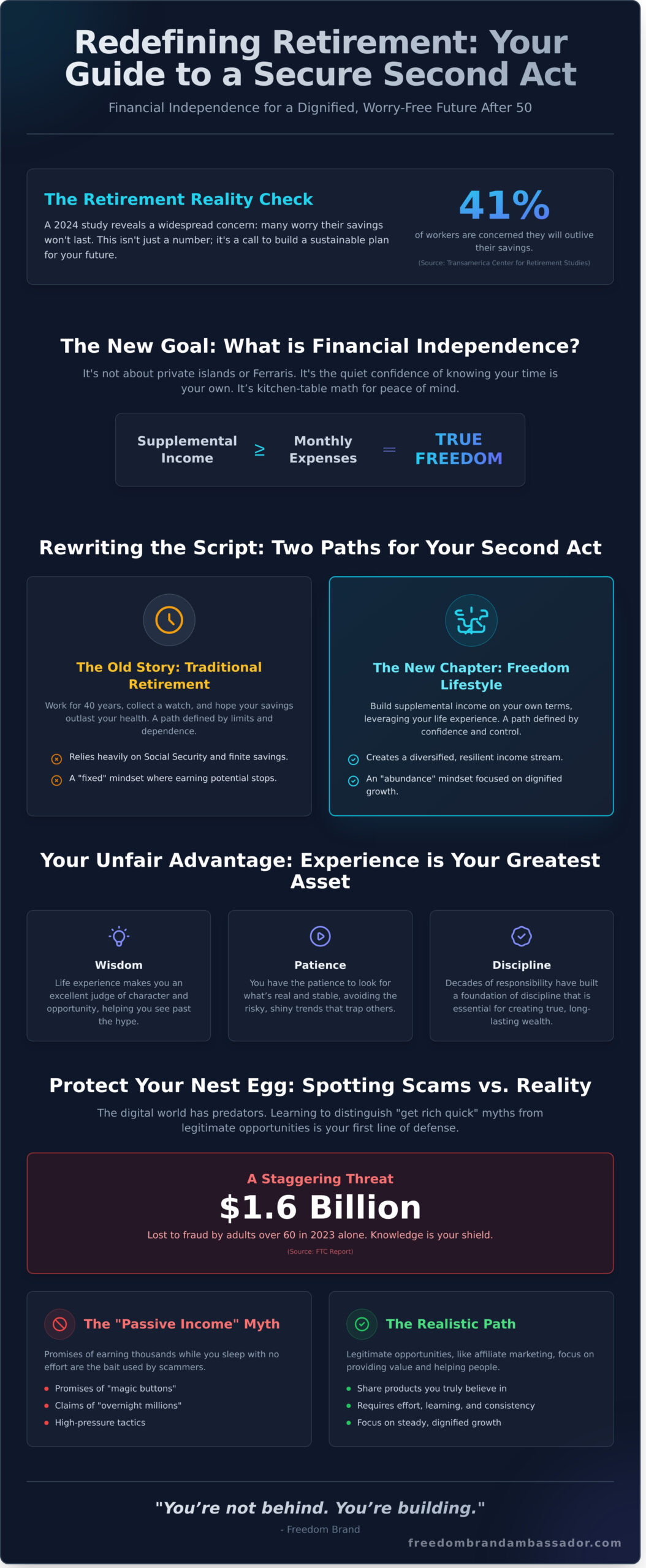 You’ve lived a lot of life. You’ve raised families, managed careers, and navigated complex relationships. This life experience makes you an excellent judge of character and opportunity. While younger people might chase every shiny new trend, you have the patience to look for what’s real. Shifting from a “fixed” mindset to an “abundance” mindset after 50 is powerful. You aren't “too old” to start; you're actually better prepared because you have the discipline younger generations often lack. Wisdom is the foundation of true wealth, and your history is the bedrock of your future security.