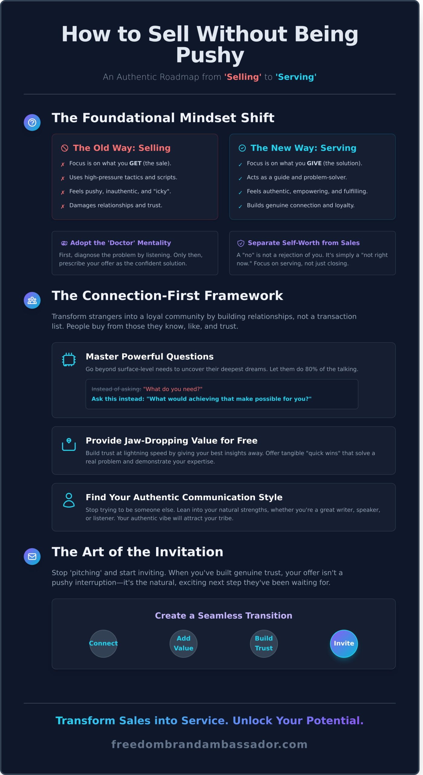 Letting your systems do the heavy lifting is the key to authentic scale. You focus on creating value, and the technology handles the outreach. This isn't just about making more money; it's about creating a bigger impact and designing your dream lifestyle. This is how to sell without being pushy-by building a machine that serves, nurtures, and invites. Your journey to freedom starts with smarter systems, and you can learn more at freedombrandambassador.com.