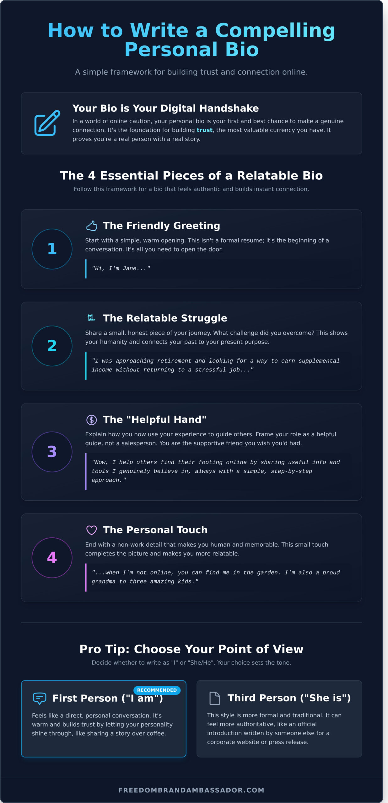 Forget those stiff, corporate-sounding bios. Learning how to write a compelling personal bio is simply about telling a short, honest story that helps people feel like they know you. It’s the first step in building genuine trust and connection, especially online.