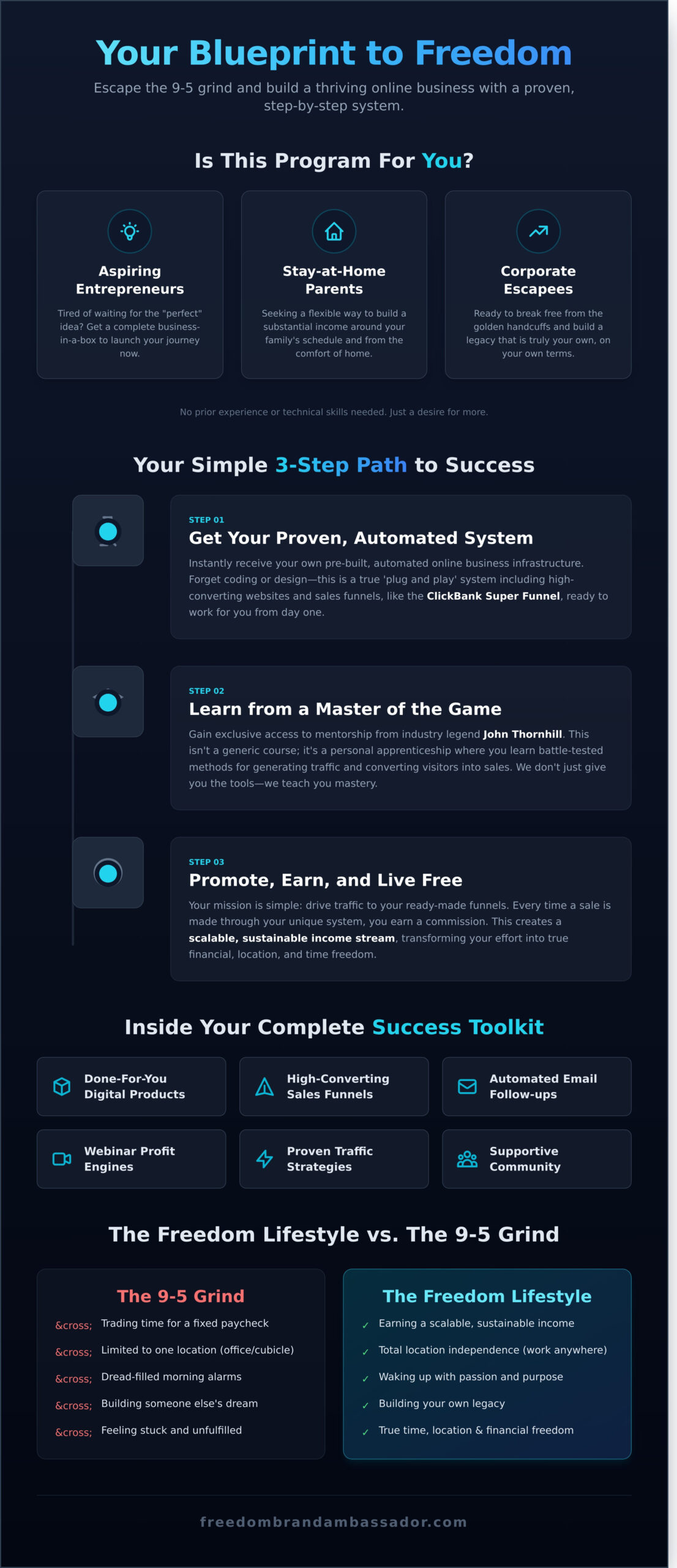 This is where your journey changes. We’re pulling back the curtain on the Freedom Brand Ambassador program, a genuine blueprint designed for people just like you who are ready for more. In this article, you will discover the proven system that provides the exact tools, step-by-step training, and unwavering support you need to leave the 9-5 grind behind for good. It’s time to build a thriving online business that you love and join a community that celebrates your success. Your new life starts now.