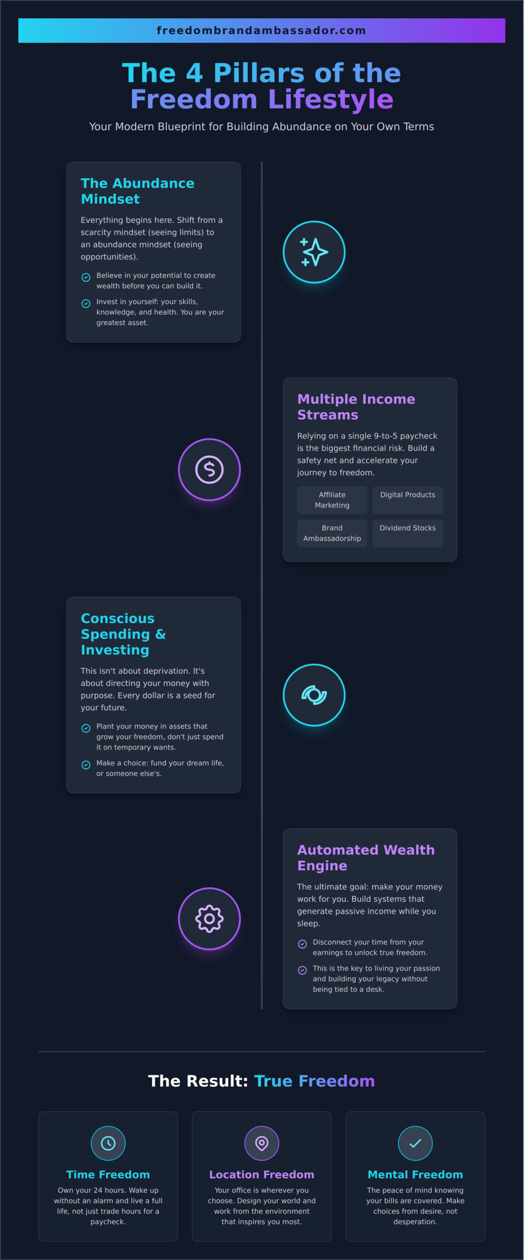 • Discover the 4 Pillars of the Freedom Lifestyle, your modern blueprint for building abundance without restrictive budgeting.